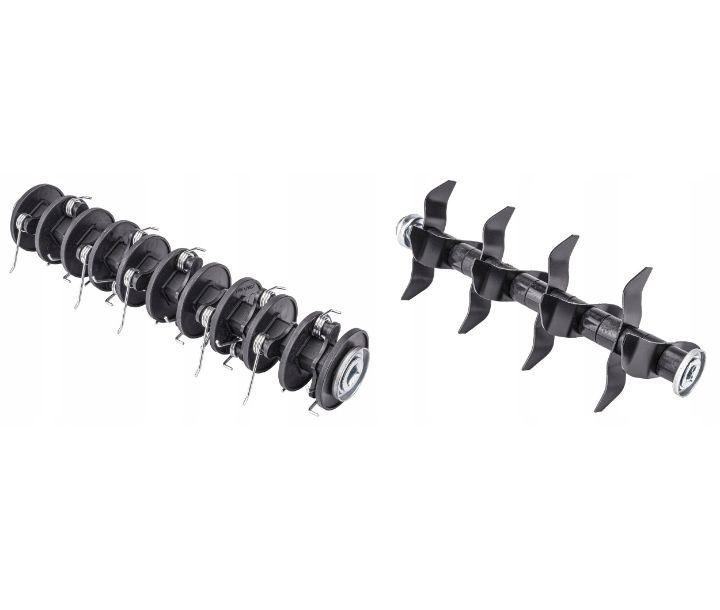 Wymienne wałki pozwalają szybko przełączać się między aeracją a wertykulacją. Jeden rozluźnia i napowietrza glebę, drugi usuwa mech i filc, poprawiając regenerację trawnika.