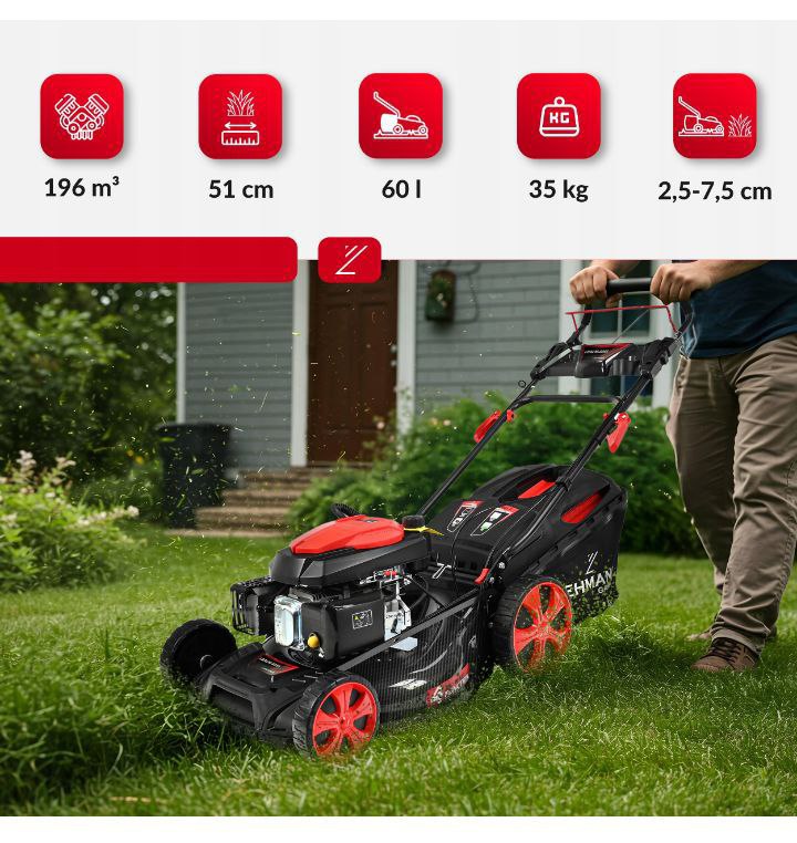 Jeżeli potrzebujesz kosiarki do większego ogrodu, działki albo terenu z gęstą, nierówną trawą, Lehmann Bugle została stworzona właśnie do takich zadań. To model z napędem, mocnym silnikiem OHV 196 cm3, szerokością roboczą 51 cm i wyposażeniem, które zwiększa komfort codziennego użytkowania.