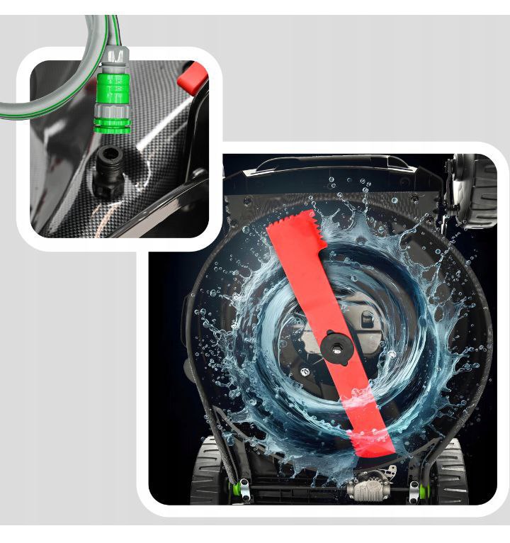 Po zakończonej pracy nie musisz męczyć się z ręcznym usuwaniem resztek trawy spod korpusu. System mycia obudowy pozwala podłączyć wąż ogrodowy i wygodnie wypłukać wnętrze obudowy.