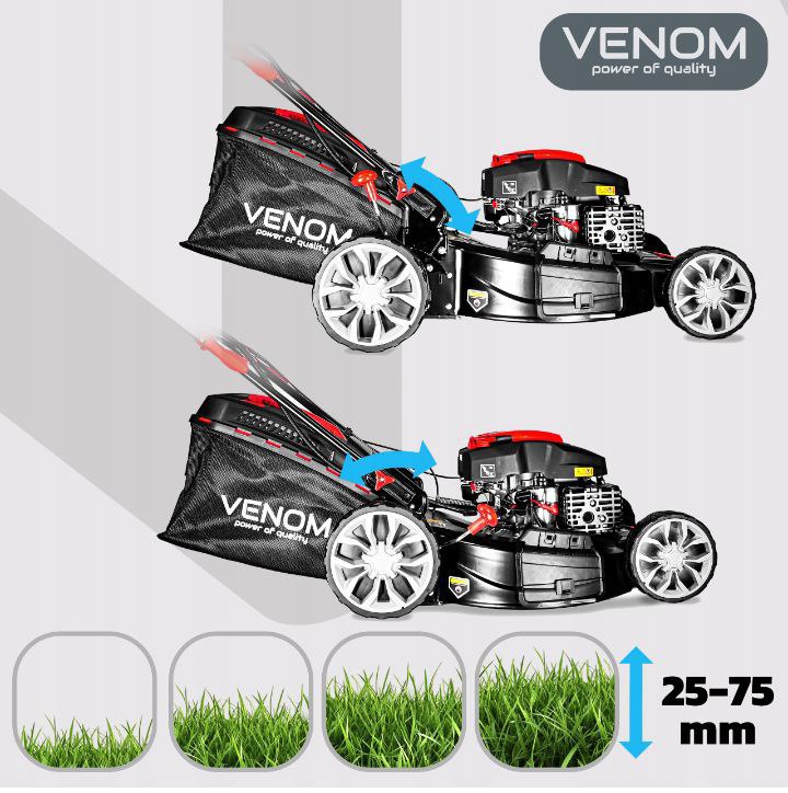 - Kosiarka 10w1 – tylko VENOM oferuje aż tyle funkcji w jednej maszynie: mulczowanie, wyrzut boczny, wyrzut tylny, kosz, regulację wysokości i wiele więcej.